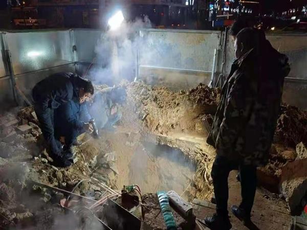 公司应急抢修组,抢修组接到通知后,即刻组织抢修人员奔赴现场,经现场勘察后发现此处为一次管网破裂,查明情况后,抢修组及时找到漏点,同时联系安全管理部、热力公司做好安全防护措施,关闭一次管网主管道阀门,调用应急抢险设备对管网破裂处进行开挖、抽水、焊接等工作,通过各部门紧密配合,协同合作,各环节无缝链接,经过10个小时的不间断抢修,目前已完成地面回填,并恢复供暖。