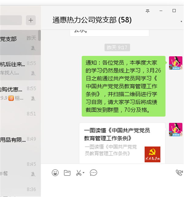 在新冠肺炎疫情期间为继续增强党员干部的党建知识的积累,发挥支部管理党员、教育党员的功能,近日,热力党支部组织党员通过线上集中学习《党员教育管理工作条例》相关内容、了解党员日常教育管理方式、党员教育基本任务等内容,增强党员对工作条例内容的了解和认识。